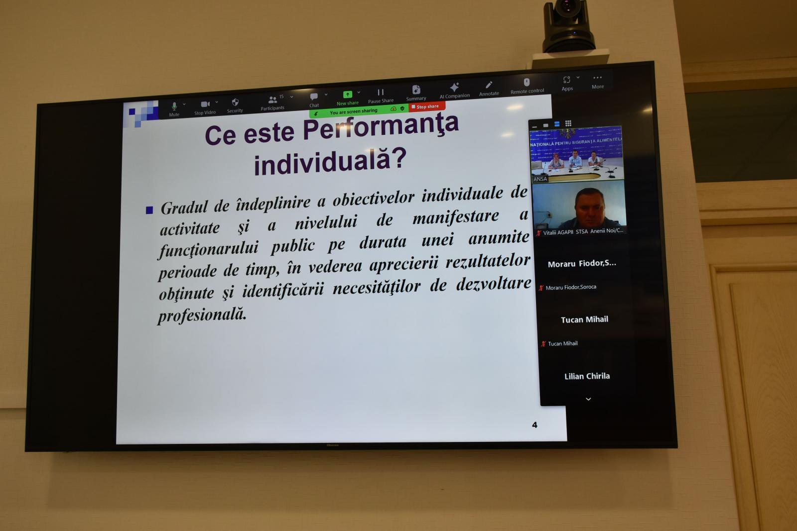 Managerii subdiviziunilor teritoriale au fost familiarizați cu privire la procesul de desfășurare a evaluării funcționarilor publici din cadrul Agenției Naționale pentru Siguranța Alimentelor, fiind totodată precizate aspectele importante cu privire la evaluarea performanțelor profesionale.
